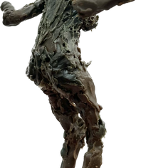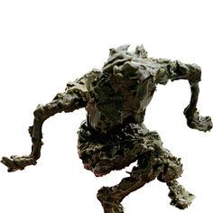 The human-bird figures, and the ground they emerge from, are modelled in dark wax as if they had been mummified in a peat bog and only just discovered.